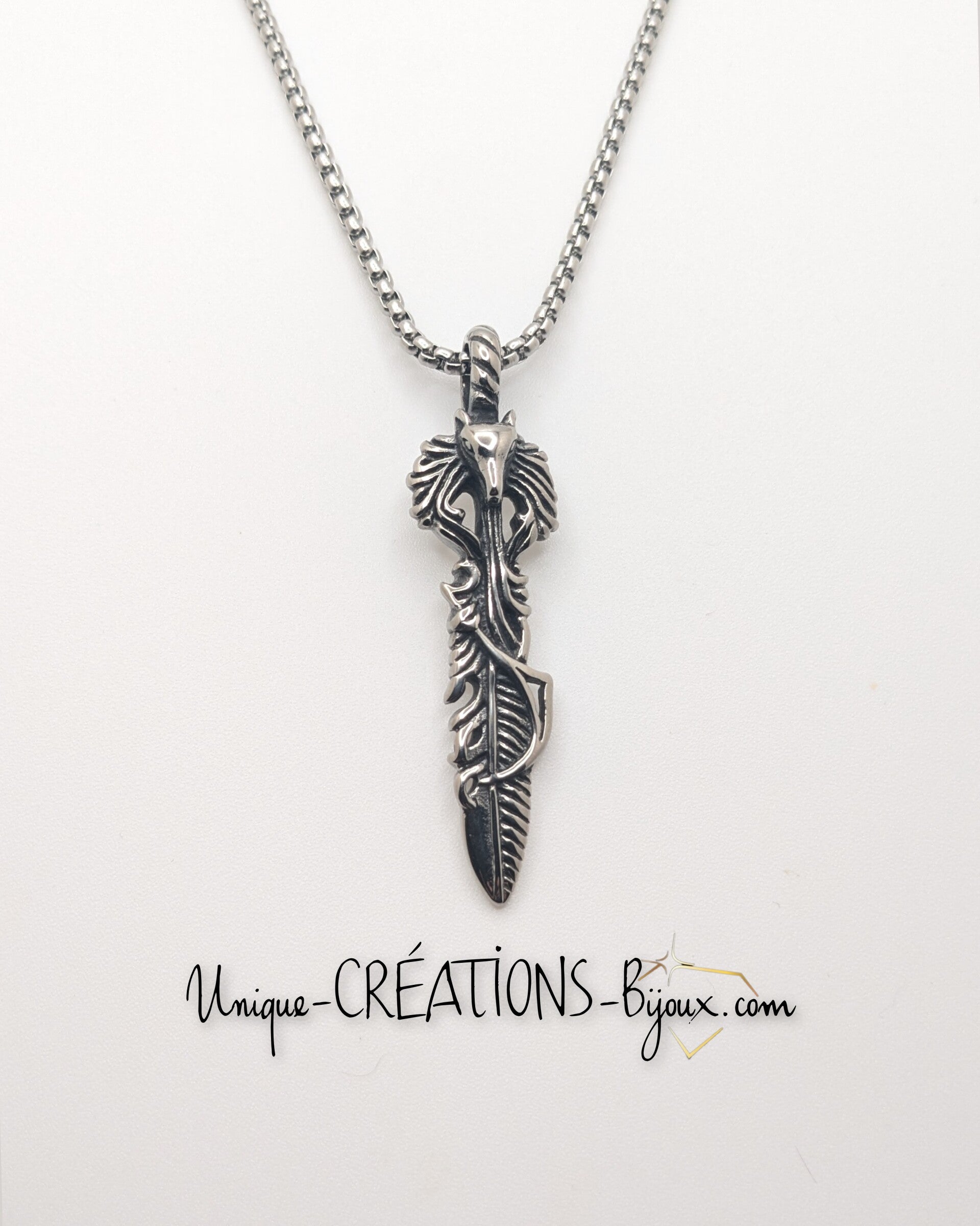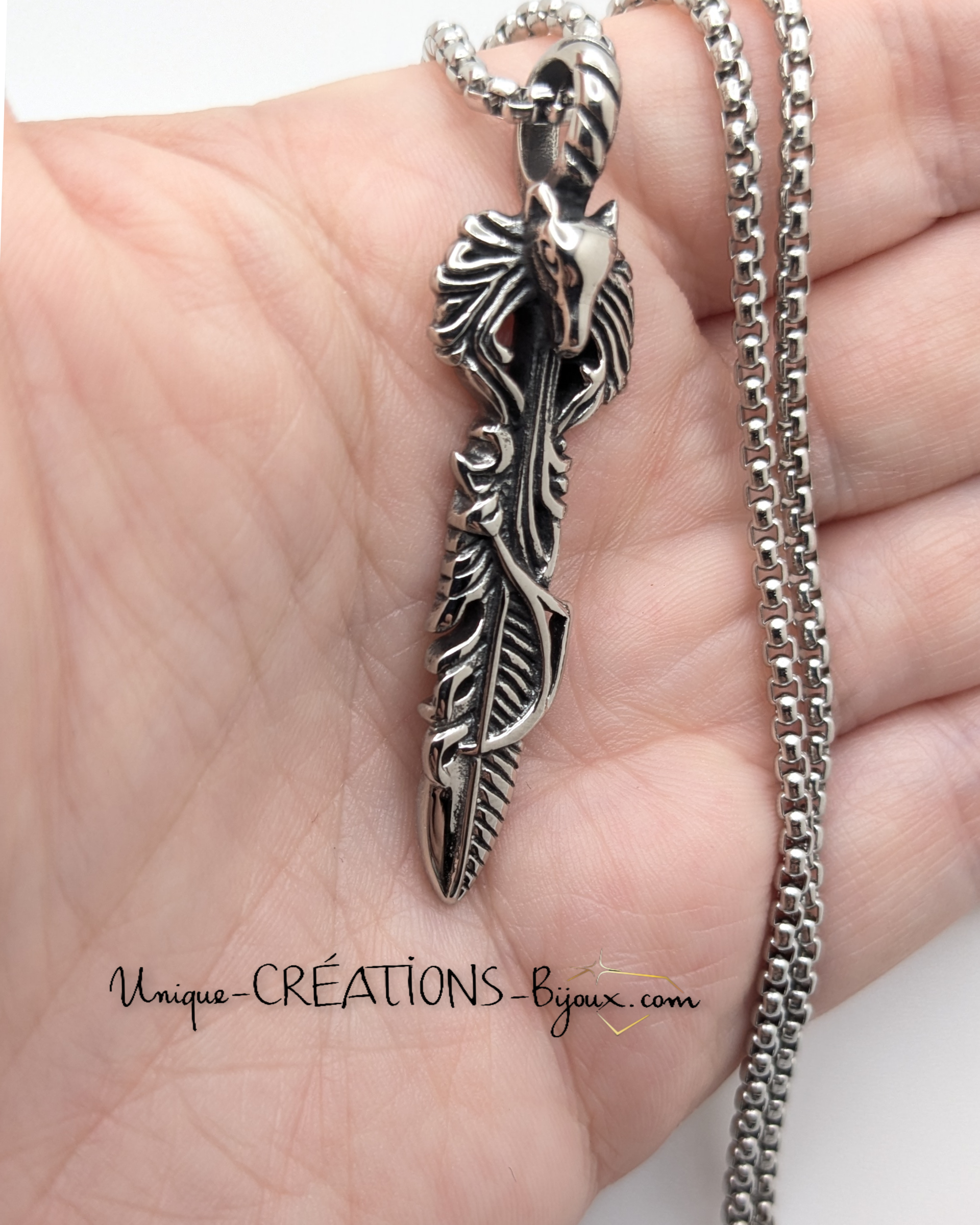 Un collier unique avec un pendentif en forme de plume surmontée d'une tête de loup. La chaîne rollo de 60 cm en acier inoxydable complète ce bijou original. Un symbole de liberté et de sagesse à porter avec fierté."