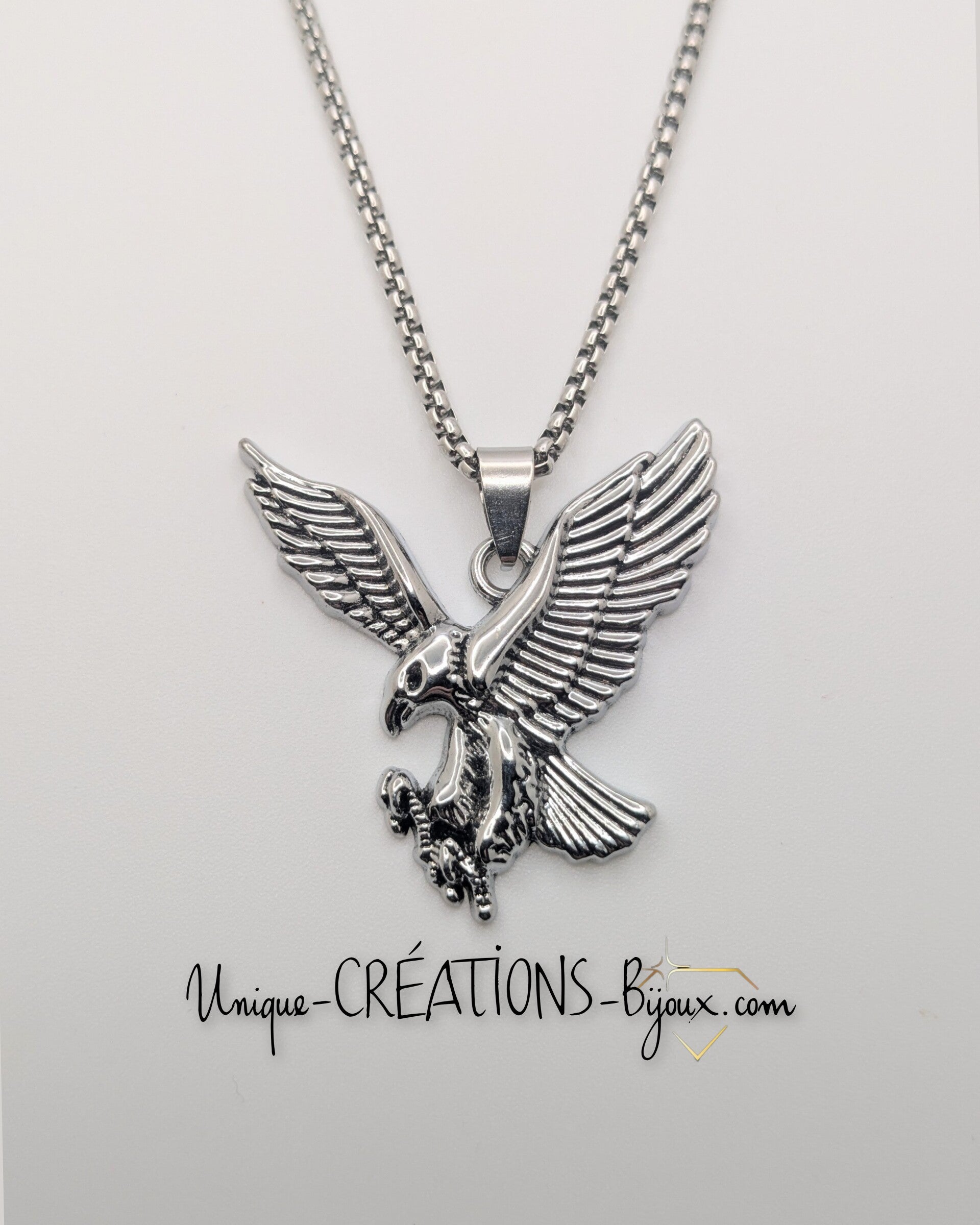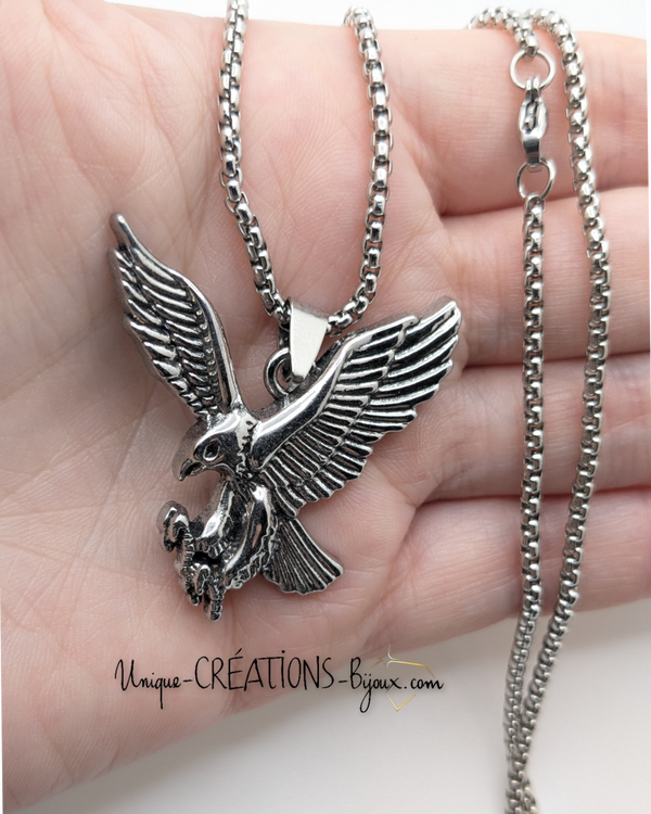 un collier majestueux avec un pendentif en forme d'aigle royal. La chaîne gourmette de 50,8 cm en acier inoxydable complète ce bijou puissant. Un symbole de force et de liberté à porter avec fierté."