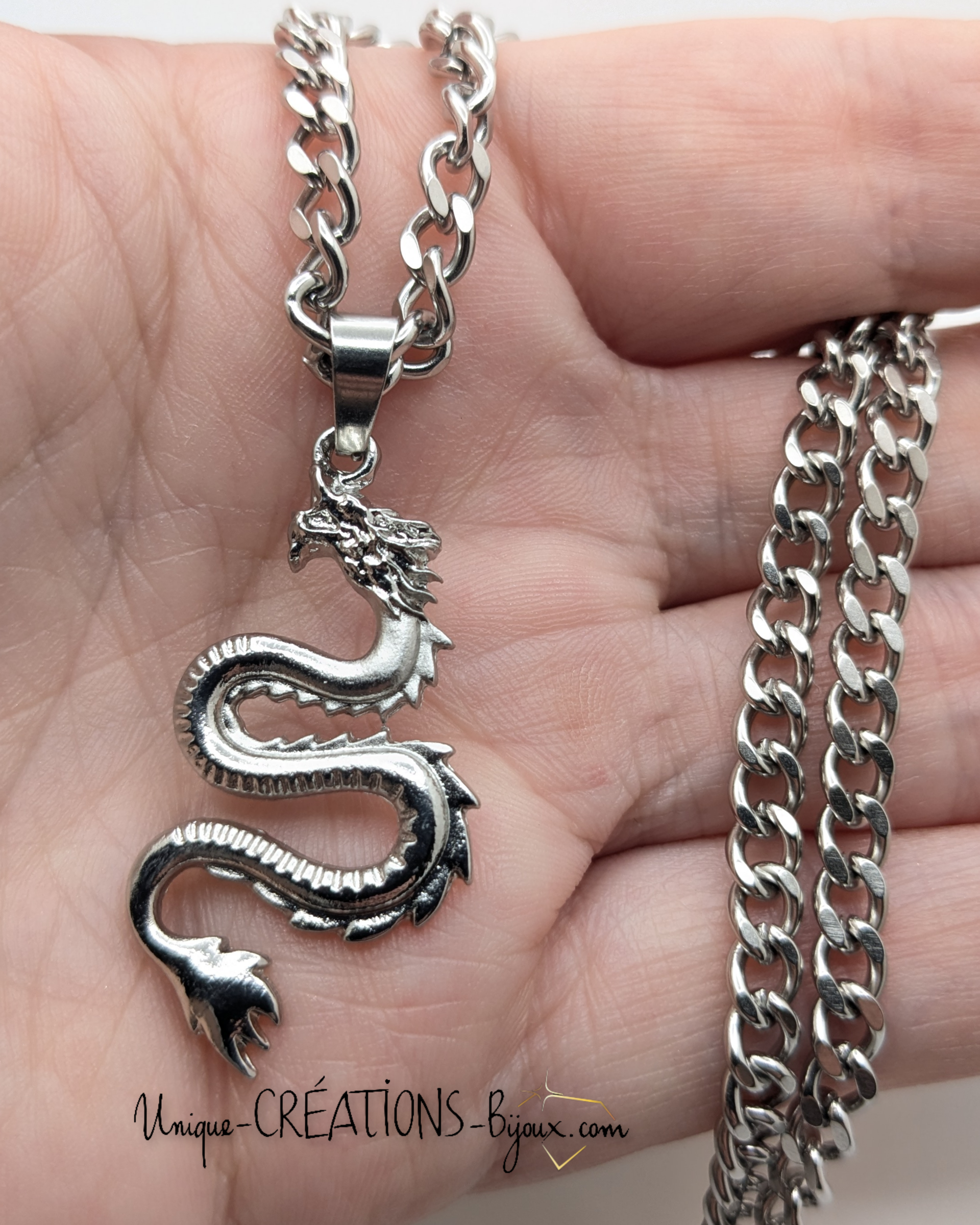 Un collier audacieux avec un pendentif en forme de dragon chinois. La chaîne cubaine de 60 cm en acier inoxydable complète ce bijou puissant. Un symbole de puissance et de sagesse à afficher avec panache.
