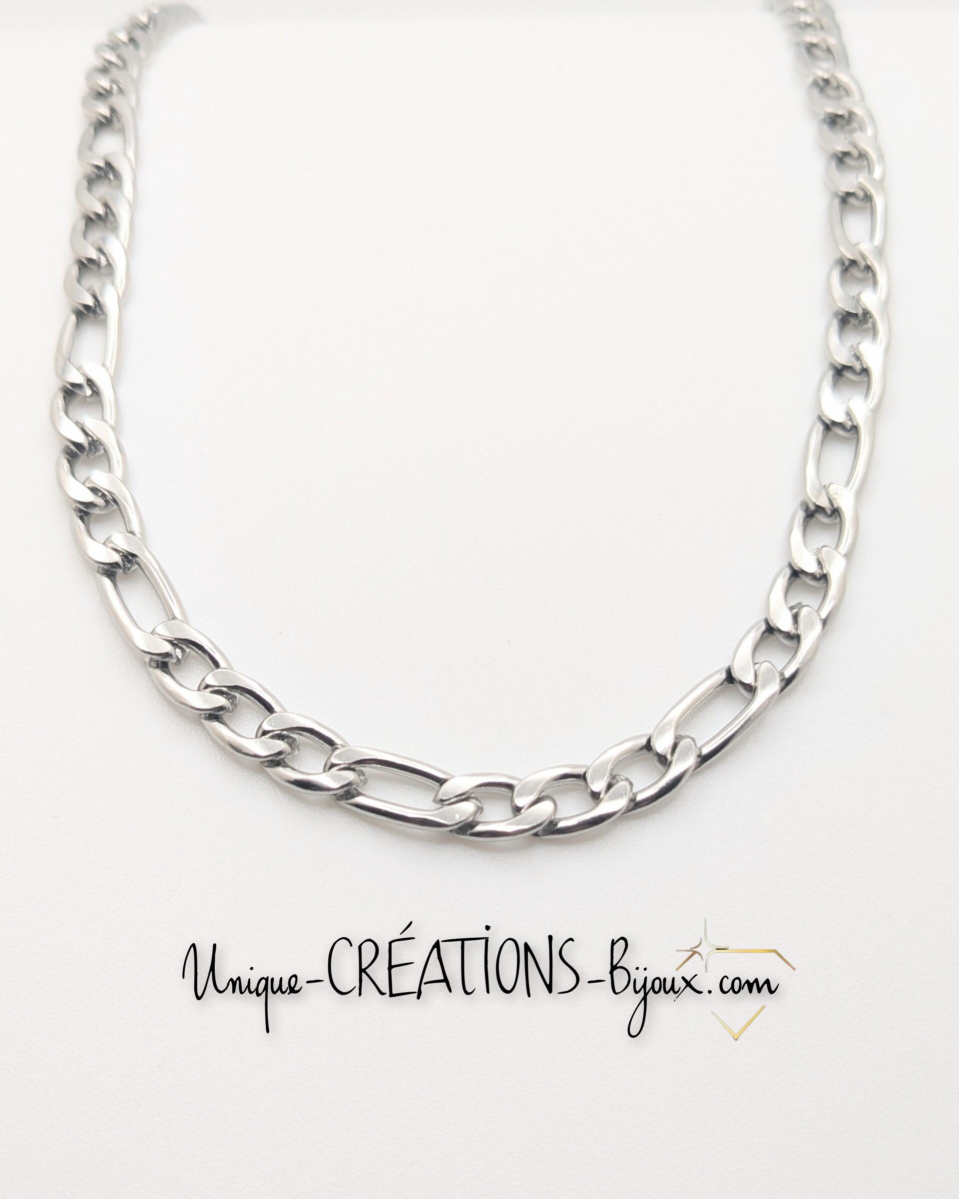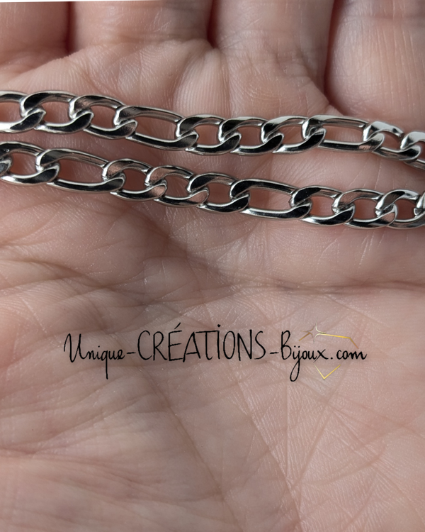 "Rehausse ton style avec notre chaîne Figaro en acier inoxydable argenté. D'une longueur de 20 pouces et d'une épaisseur de 5 mm, elle est parfaite pour un usage quotidien ou pour des occasions spéciales. Son fermoir en pince de crabe assure une fermeture sécurisée. L'entretien est un jeu d'enfant : un savon doux suffit, pas besoin de produits corrosifs. "