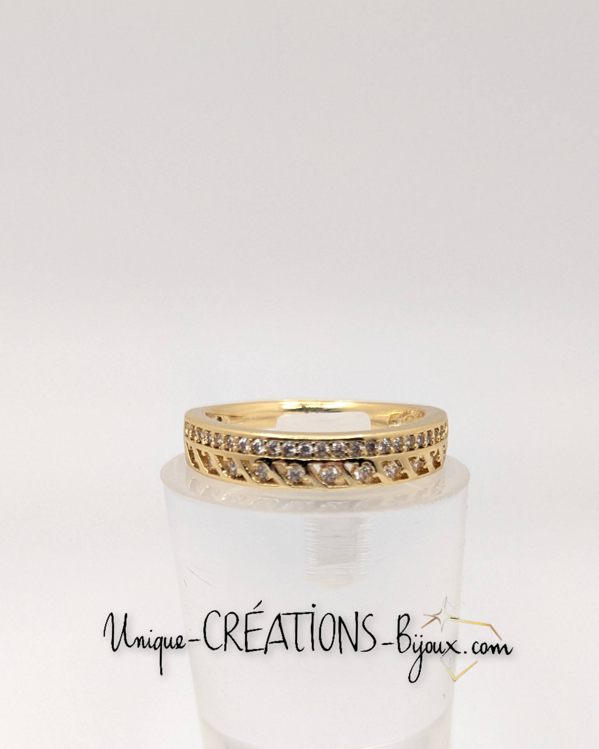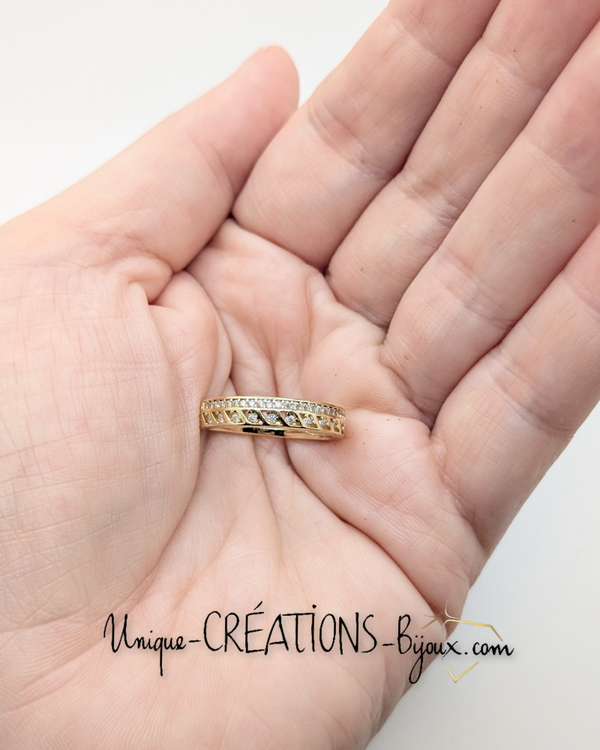 Cette bague pour femme est faite d'un alliage fusionné en or 18 carats. C'est une bague est ornée de cristaux de zircon cubique de qualité et brillants. Son design comprend un graphisme découpé au ciseau. C'est une bague d'appoint ou une bague jonc légère et confortable!
